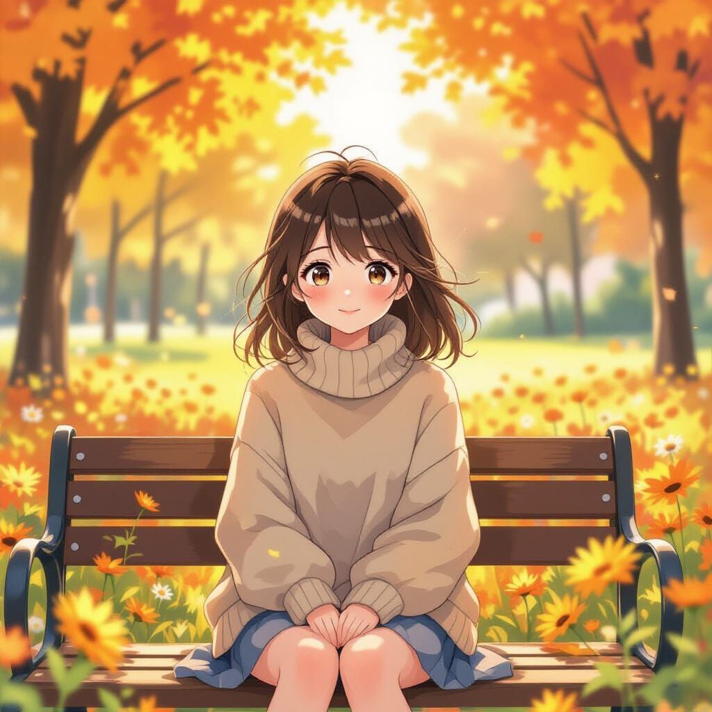 This image shows a cute anime-style girl resting on a bench amid flowers. The scene is bathed in soft sunlight filtering through autumn leaves, rendered with painterly textures and a nostalgic atmosphere.