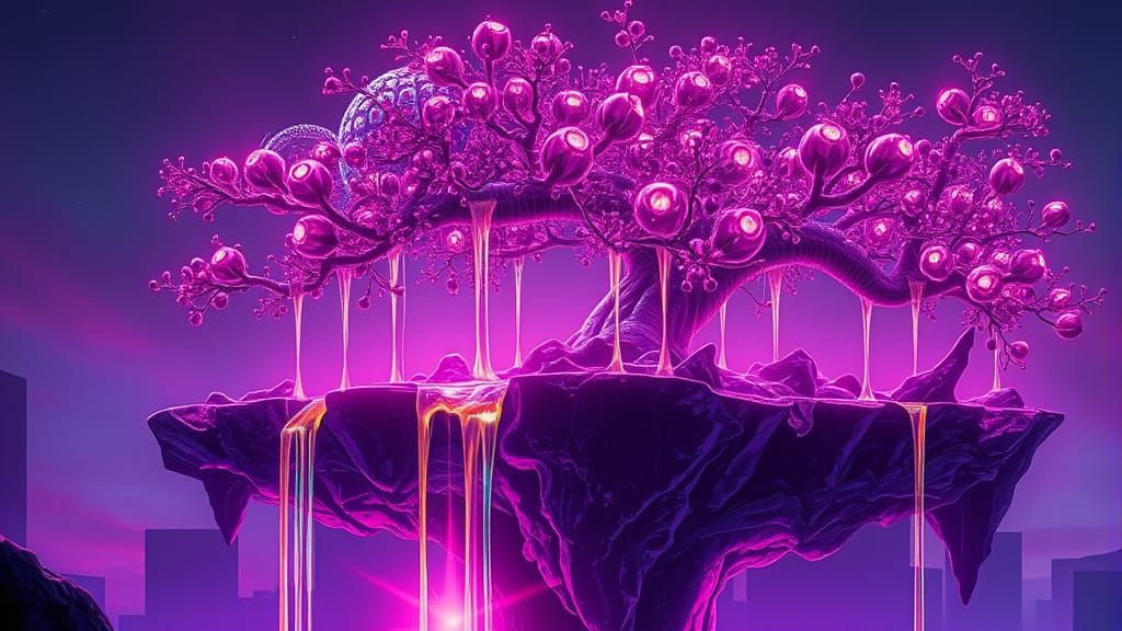 This image shows a futuristic tree growing from a dark, obsidian island, surrounded by glowing neon liquid and radiant light, blending H.R. Giger's biomechanical style with Zdzisลaw Beksiลski's surreal atmosphere.