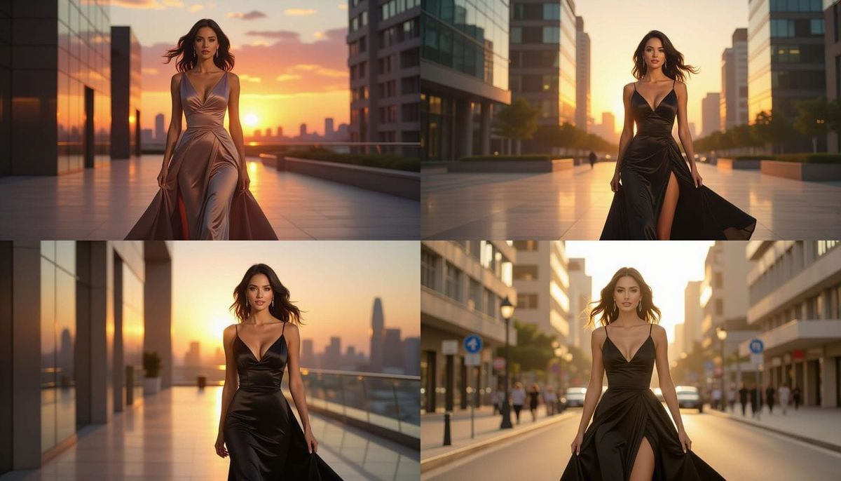 This image shows a beautiful woman in an elegant dress with flowing hair, confidently walking through a modern city at sunset. The scene is captured in a cinematic style.