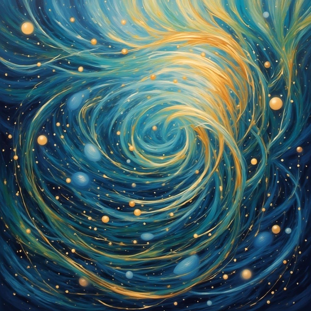 This image showcases dynamic, abstract swirls of liquid light in vibrant blues, greens, and golds. It evokes a sense of flowing energy and momentum, rendered in a detailed digital painting style with cinematic lighting.