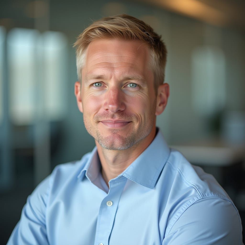 This image is a traditional passport-style portrait of a 35-year-old man with short blond hair, wearing a light-blue business shirt, against a softly blurred office background.
