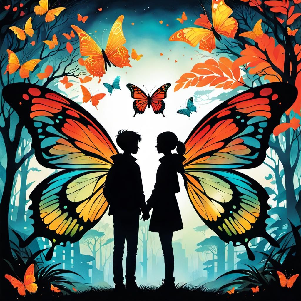 (((Silhouette of a girl and boy with bright butterfly wings ))) butterfly, hdr, vibrant, surrealism, hyperdetailed, hypermaximalist illustration by Meg Chikhani, Victo Ngai, Rlon, Andreas Lie, Android Jones ((in love ))