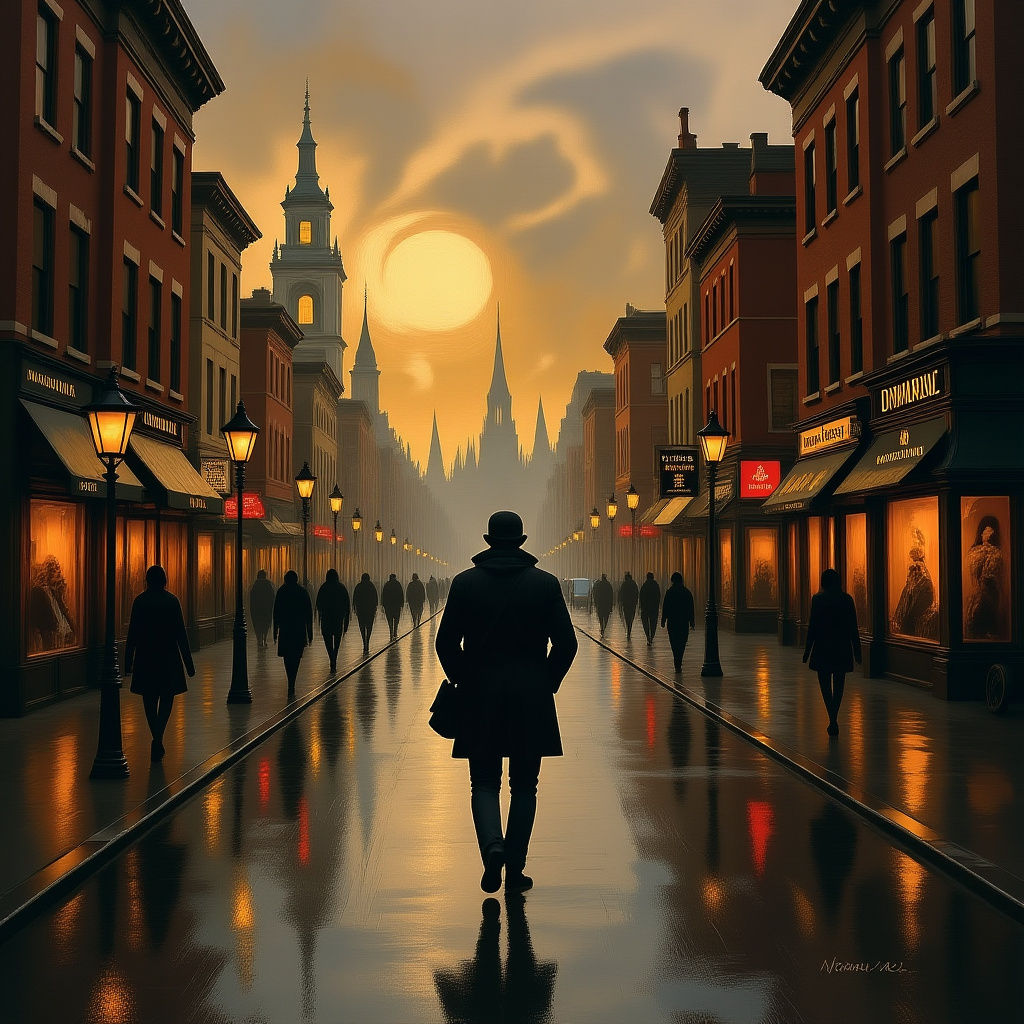 A digital artwork depicting a Philadelphia street scene in the style of abstract expressionism. The image features swirling neutral colors and expressive details with a gilded obsidian backdrop.