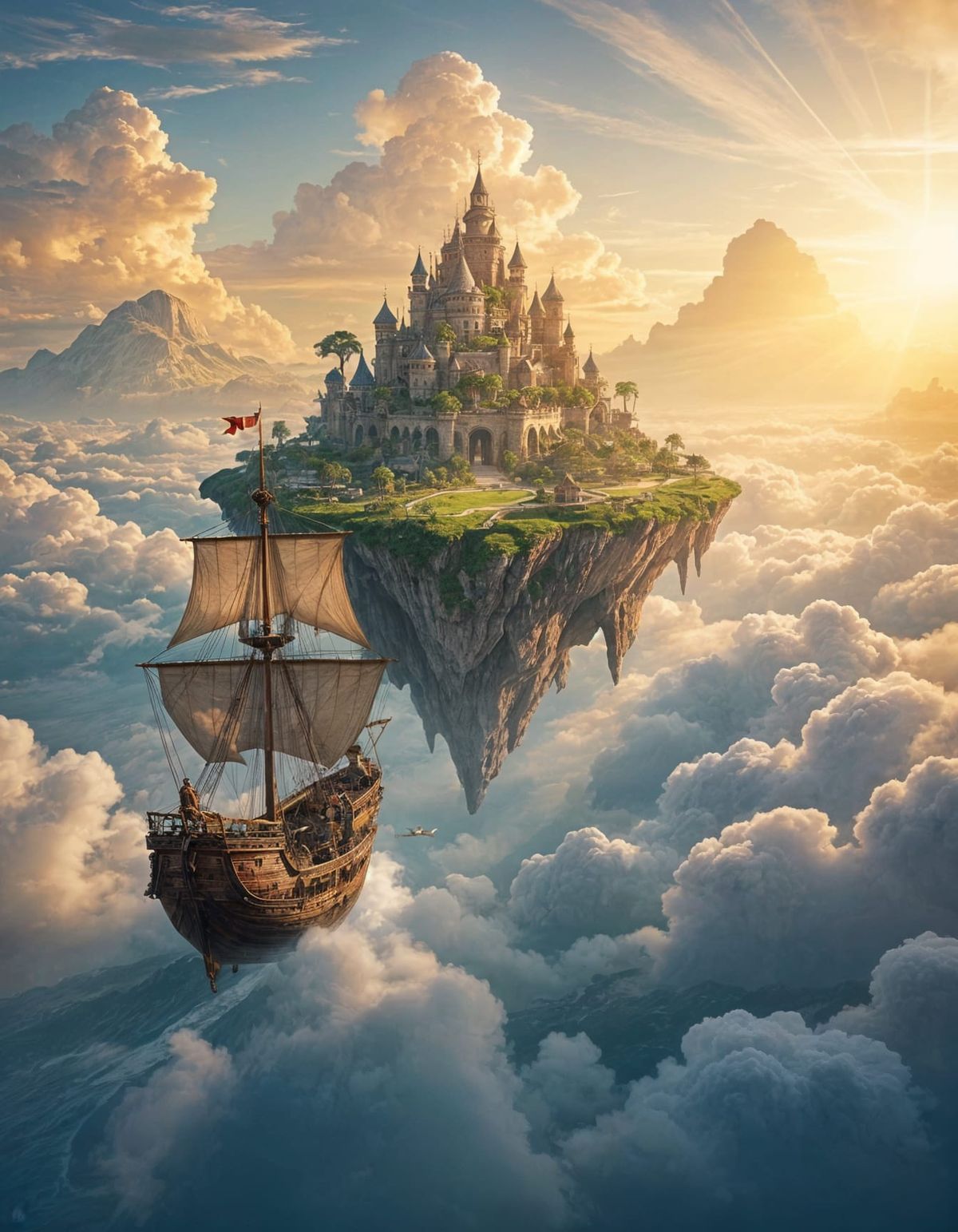This image shows an ancient flying galleon sailing towards a lush floating island amidst radiant, cinematic lighting. The scene evokes epic fantasy adventure and magical beauty.