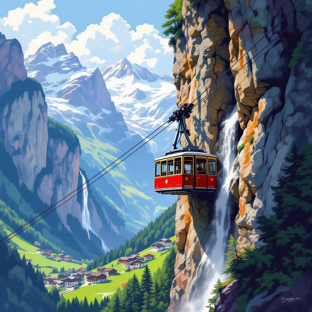This image depicts a vintage cable car climbing a cliff in the Swiss Alps, reminiscent of classic travel posters. Features cascading waterfalls and distant chalets, rendered in vibrant, illustrative colors with a retro aesthetic.