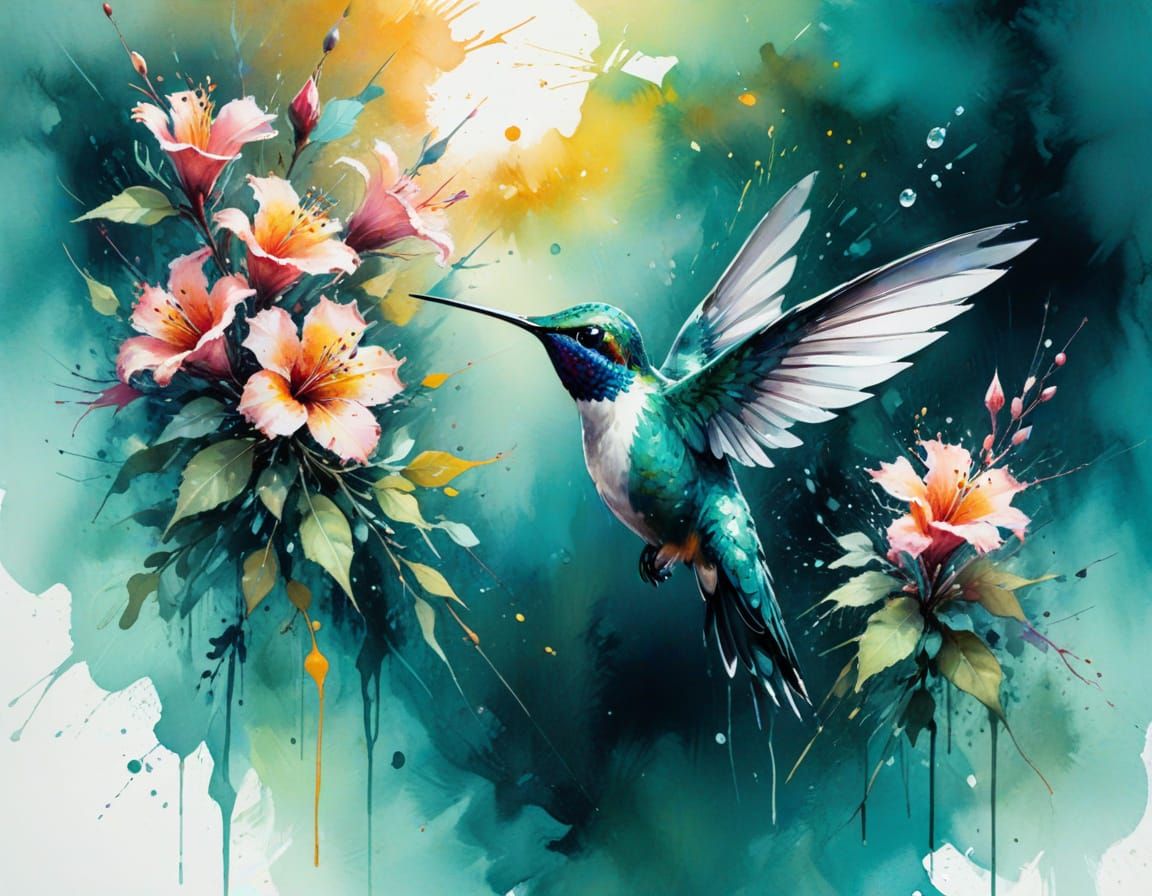 A digital watercolor of an iridescent hummingbird amidst luminous blossoms. The artwork features deep magentas, teals, and citrus tones with fantastical lighting in a gentle pastel palette, styled with expressive watercolor techniques.