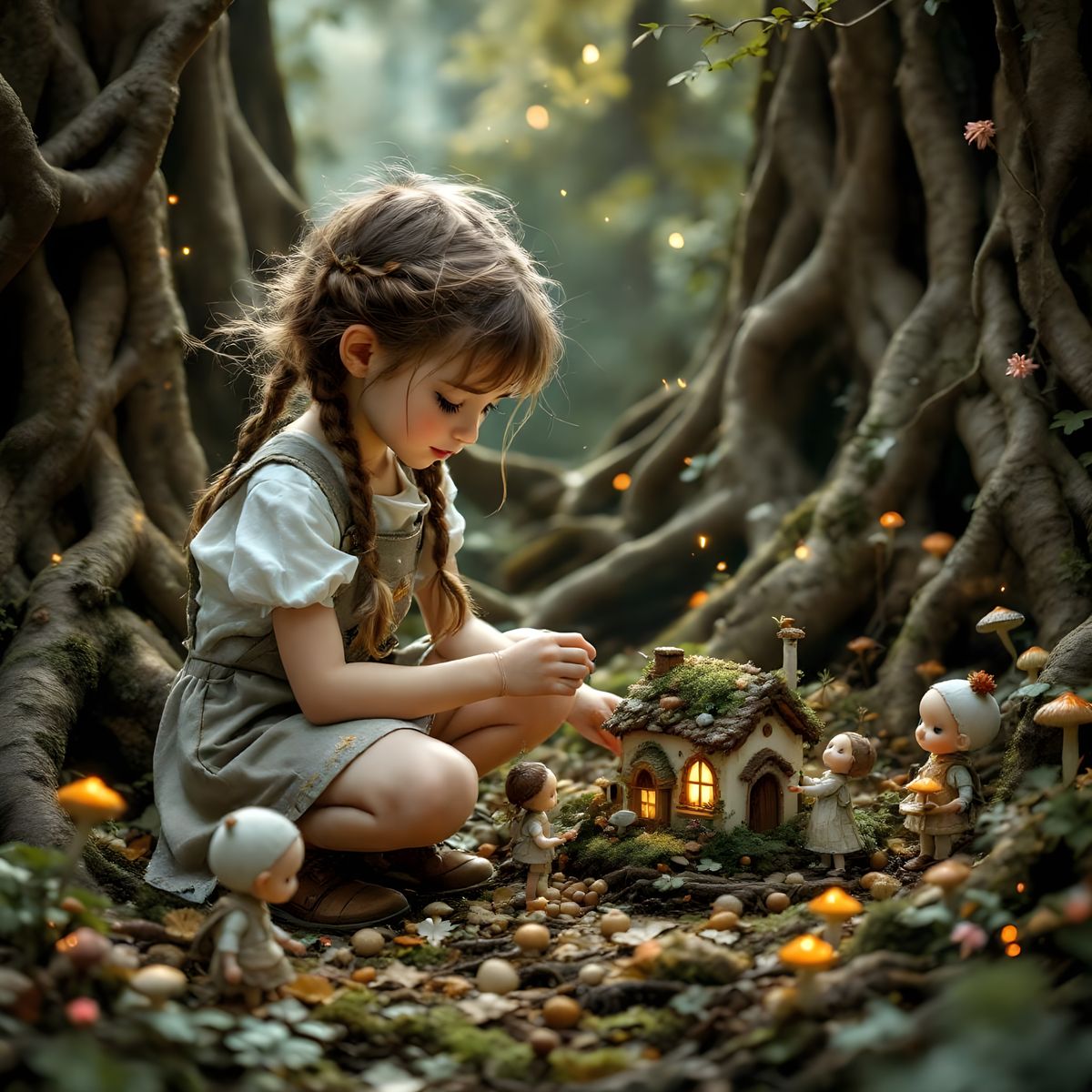 This image shows a little girl helping porcelain dolls build a house in the woods. The scene is photorealistic with high contrast, focusing on woven fabric and chipped porcelain in forest tones.