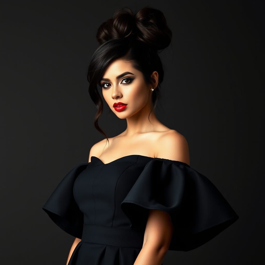 This striking portrait features a beautiful brunette woman in a stylish black mini dress with a voluminous silhouette, set against a high-contrast black and white background with subtle fractal patterns, evoking the elegance of silkscreen art and the futuristic aesthetic of fractal art.