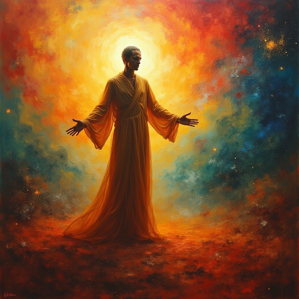 A vibrant image of a person in a robe against a cosmic backdrop. Swirling colors create a mesmerizing dance in a bold, abstract style.