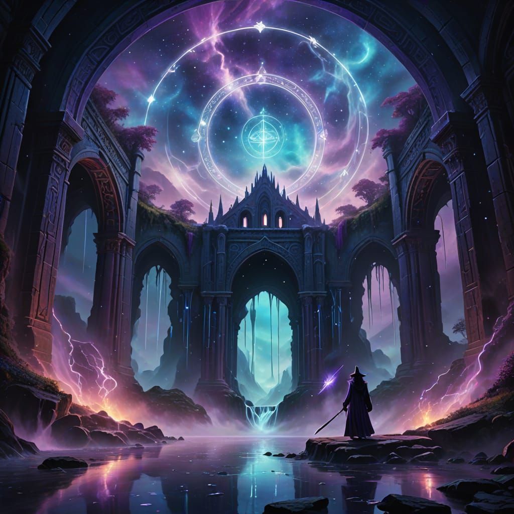 This fantasy digital matte painting depicts a witch in a purple gown drawing a glowing magic circle near misty waterfalls, set against a dramatic cosmic backdrop with auroras and nebulae.