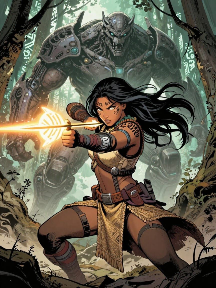 This comic cover art depicts Aiyana, a fierce warrior with tribal markings, firing a glowing arrow at a monstrous bio-armor beast amidst a dense, glyph-filled forest, rendered in a dynamic, vibrant comic style.