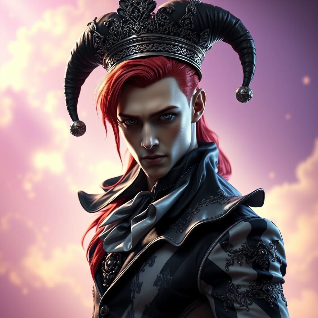 A majestic male jester with chiseled features and piercing eyes, set against a heavenly purple and yellow backdrop, exuding an air of seductive mystique and divine presence, rendered in 8k resolution with hyperdetailed textures and volumetric lighting effects, blending Art Nouveau elegance with gothic se...
