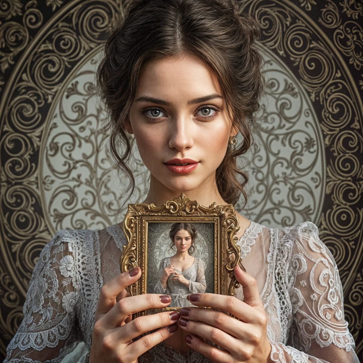 This image shows a stunning, hyperrealistic portrait of a woman in a beautiful, infinite reflection, creating a mesmerizing visual effect.