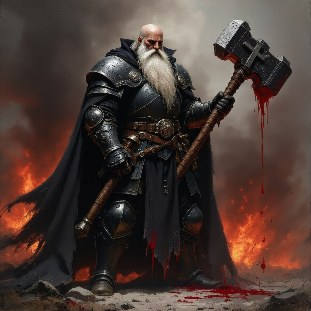 This image shows a bald, elderly warrior with a long white beard, clad in black plate armor and coat, wielding a bloody warhammer. The artwork is in a dark fantasy style.
