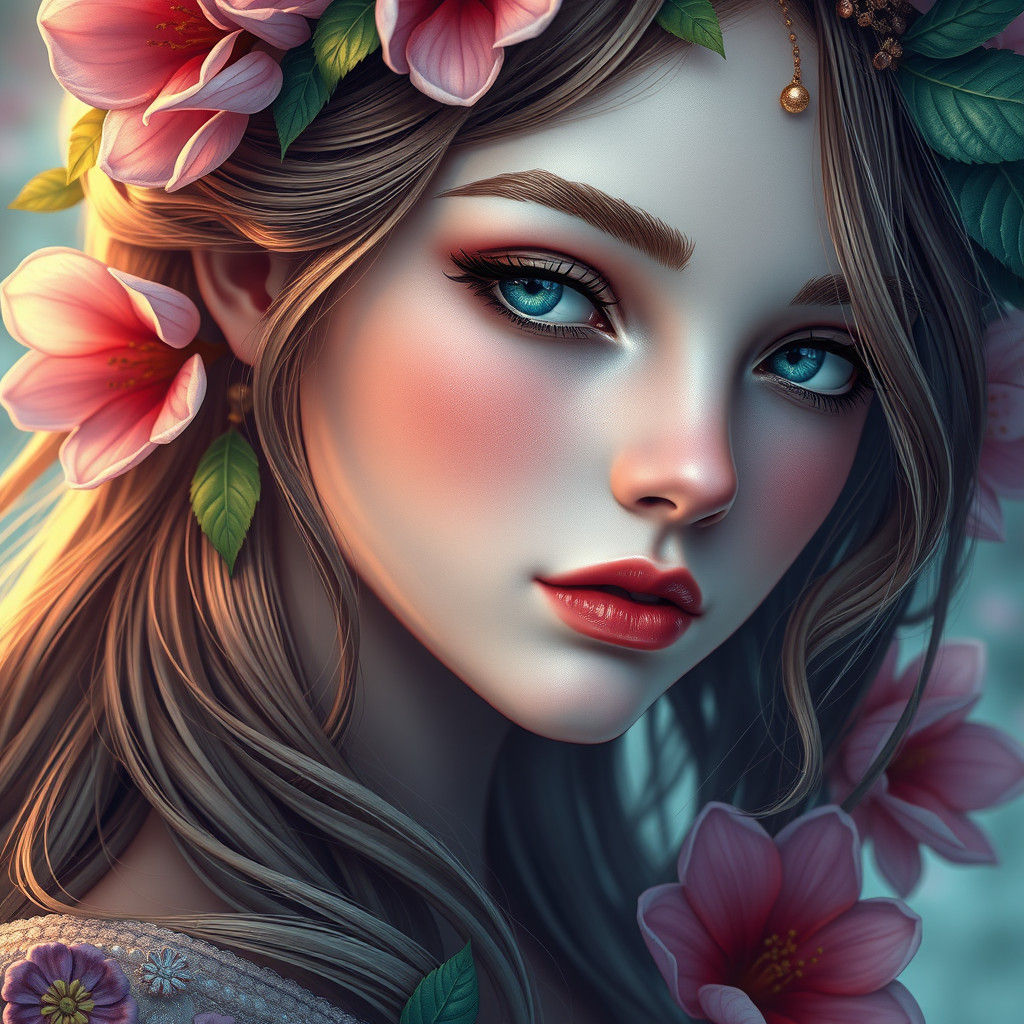 A striking picture of a fantasy flower girl with petals woven into her hair. The image features vibrant colors, dynamic lighting, and hyperdetailed textures in an Art Nouveau style.