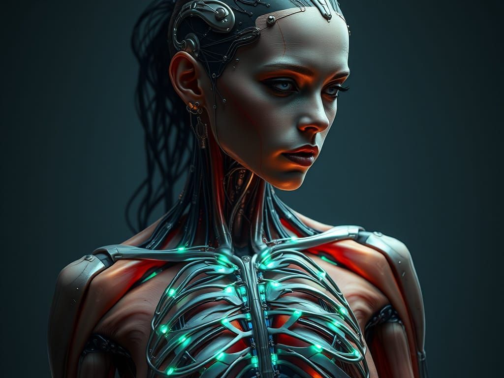 Incredible design! 🤖💡 The mix of human elegance and exposed cybernetic anatomy is mesmerizing. Love the glowing circuitry and the calm, focused expression—feels like she’s self-aware and powerful. Totally captivating and beautifully crafted! 🔧✨🧠