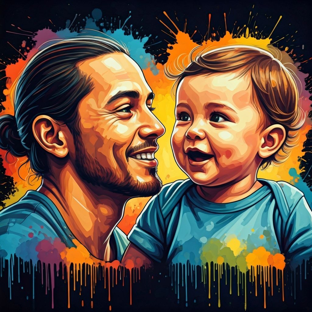 A vibrant portrait captures a smiling adult and baby sharing a loving gaze. The image, rendered as street art, features high contrast and melting oil gouache effects.