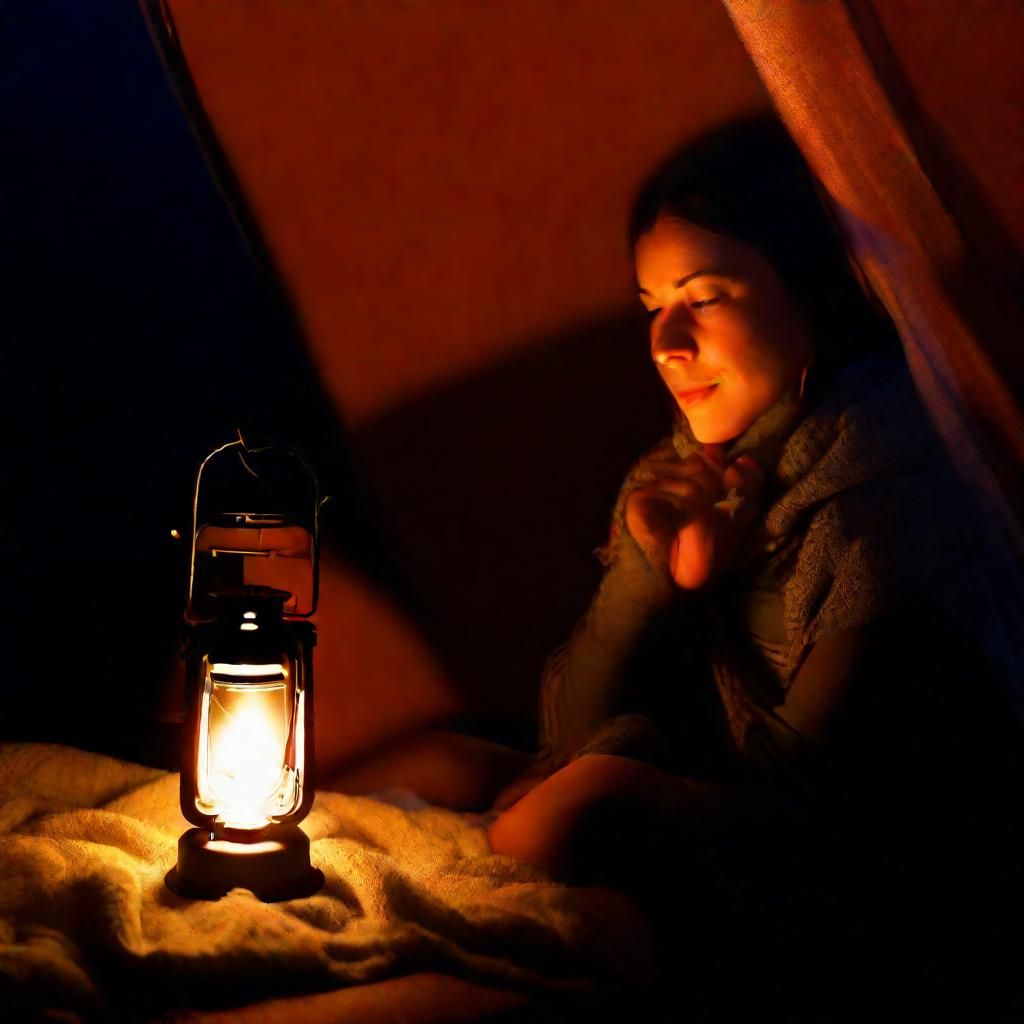 This image shows a woman inside a tent, illuminated by the soft glow of a Coleman lantern. The scene evokes a sense of cozy, tranquil solitude in a camping setting.