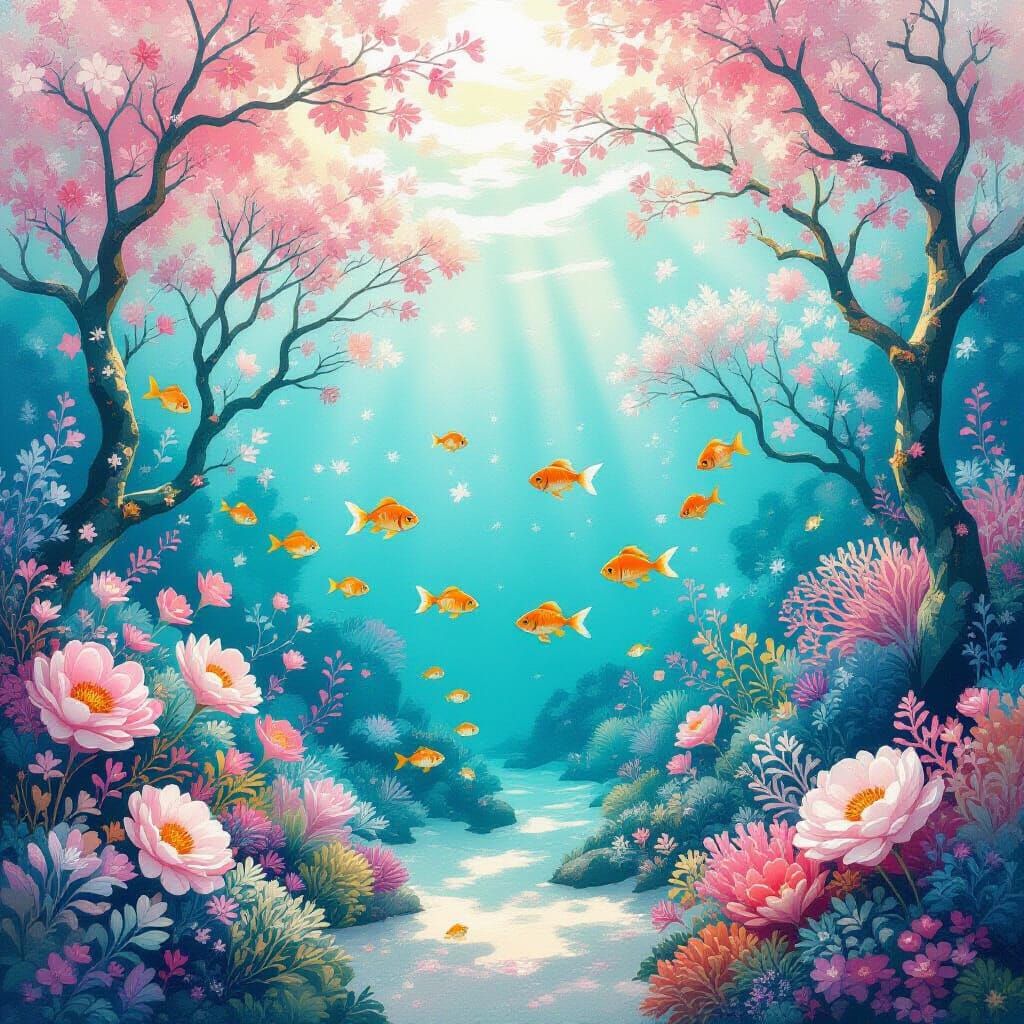This image shows a tranquil underwater garden filled with colorful coral trees and luminous flowers. Small goldfish swim gently through the scene, rendered in dreamy pastel tones. The artwork has a whimsical aesthetic.