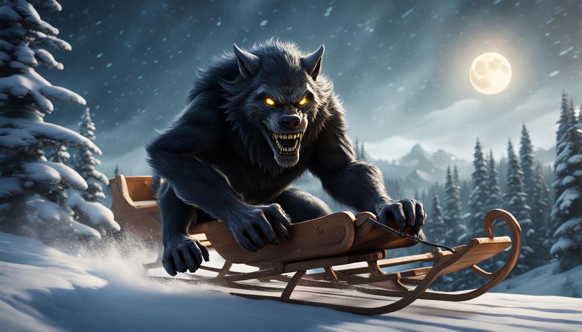 This image shows a black werewolf joyfully sledding downhill at high speed, cheeks puffed out by the wind. A detailed digital painting with rich colors and intricate details conveys a sense of fantasy and fun.