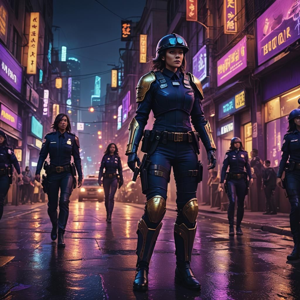 This image shows women police officers patrolling city streets at night. The fantasy concept art features intricate detail, vibrant neon lights, and strong, heroic poses in a magical realism style.