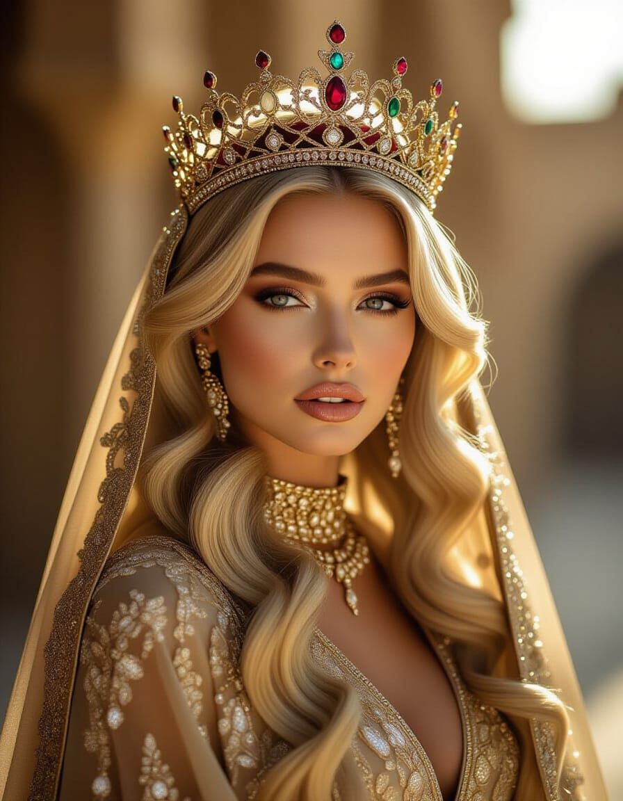 A photorealistic image of a high-fashion princess with blonde hair and a crown, wearing a luxurious abaya. Cinematic lighting captures regal elegance and rich textures.