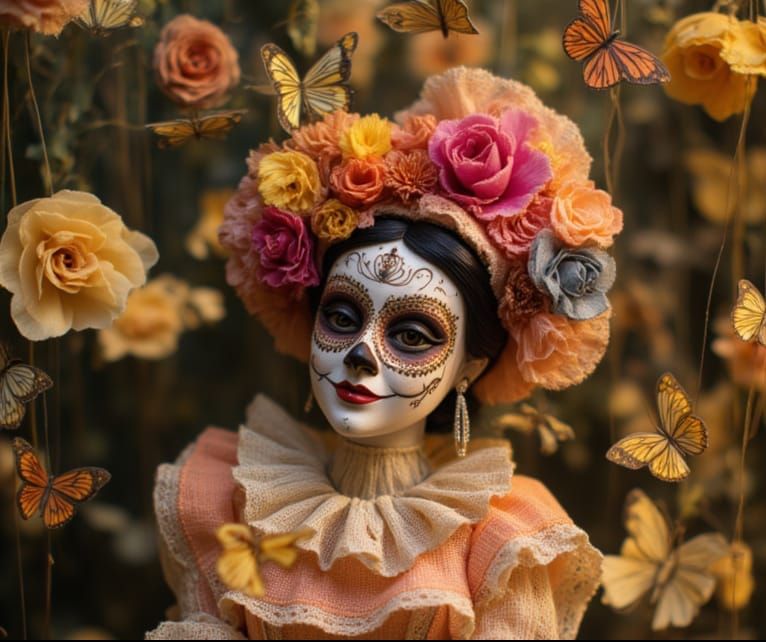 A woman wears vibrant Dia de Los Muertos makeup and flowers, surrounded by swirling butterflies in a fantasy scene with soft focus and fluid motion.