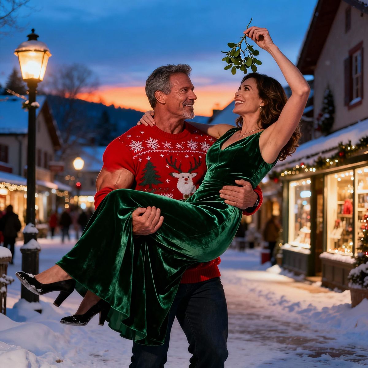 This photorealistic image captures a couple in a snowy village square at twilight. The man carries the woman, who holds mistletoe overhead, with cinematic lighting and sharp focus.