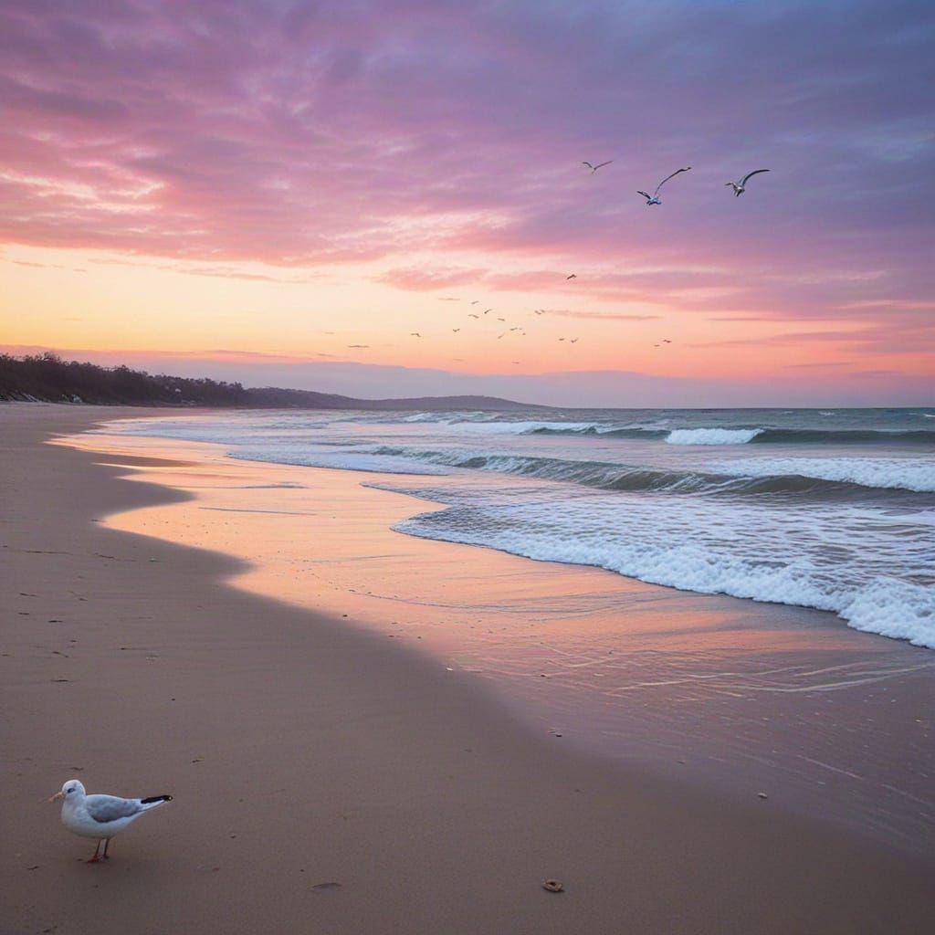 A serene sunset view of a snow-dusted beach in winter. A lone seagull flies across a pastel sky as gentle waves meet the shore. The scene evokes minimalist photography.