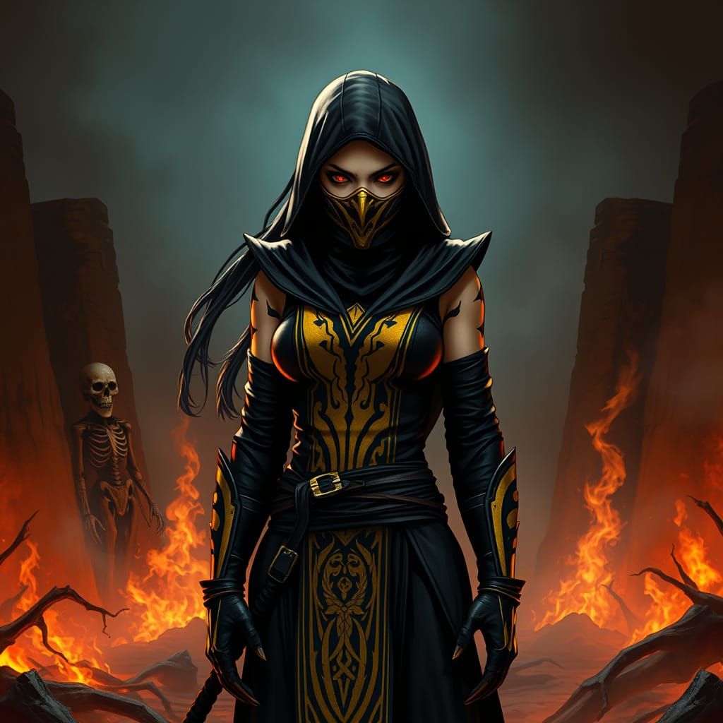 This image shows a mysterious female Scorpion figure in a dark, misty hellish environment, surrounded by flames and skeletal remains, with a striking yellow and black ninja costume.