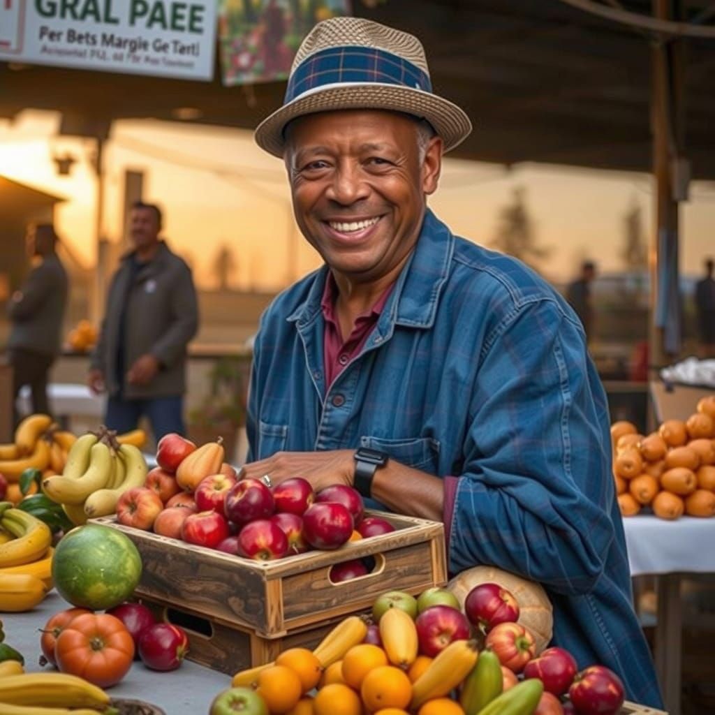 This image shows a cheerful farmer surrounded by colorful fruits at a vibrant market. The scene is captured with hyperrealistic detail, bathed in warm sunset light, and rendered with dramatic color depth.