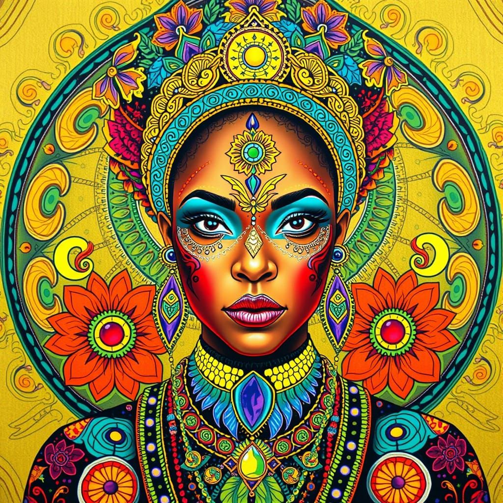 A striking picture of a Yoruba woman in colorful, futuristic clothing and jewelry. The portrait features psychedelic, mandala-like patterns, reminiscent of parchment paintings.