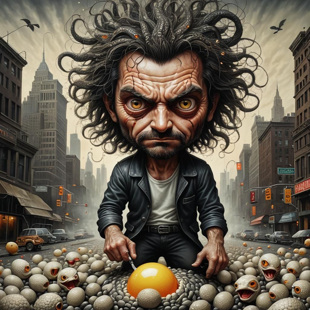A pointillist painting of Snake Plissken attempting to escape New York. The artwork exhibits pop surrealism elements and is set in a futuristic ballroom environment.