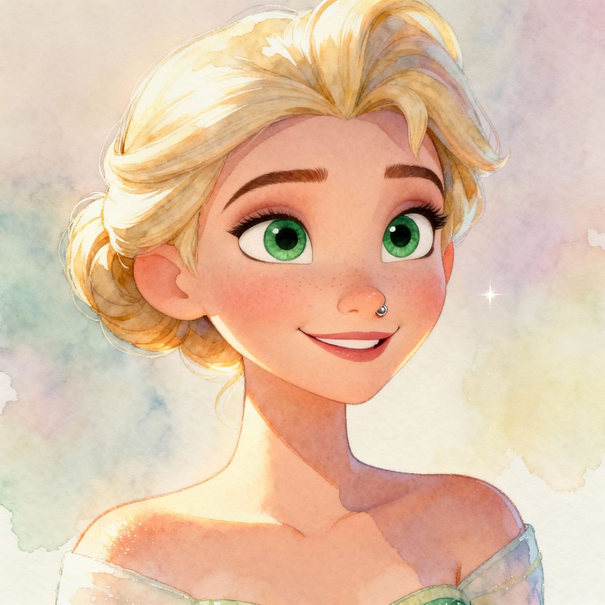 This image depicts a serene young woman with striking green eyes and blonde hair in a soft pastel setting. The artwork features a unique satin cartoon semi-realistic style, blending watercolor and Pixar-inspired elements.