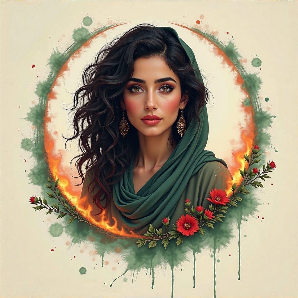 This image features a serene Palestinian woman in traditional clothing, surrounded by subtle flames and delicate flowers, set against a minimalist background with splashes of green and red, blending Arabic culture and abstract art.