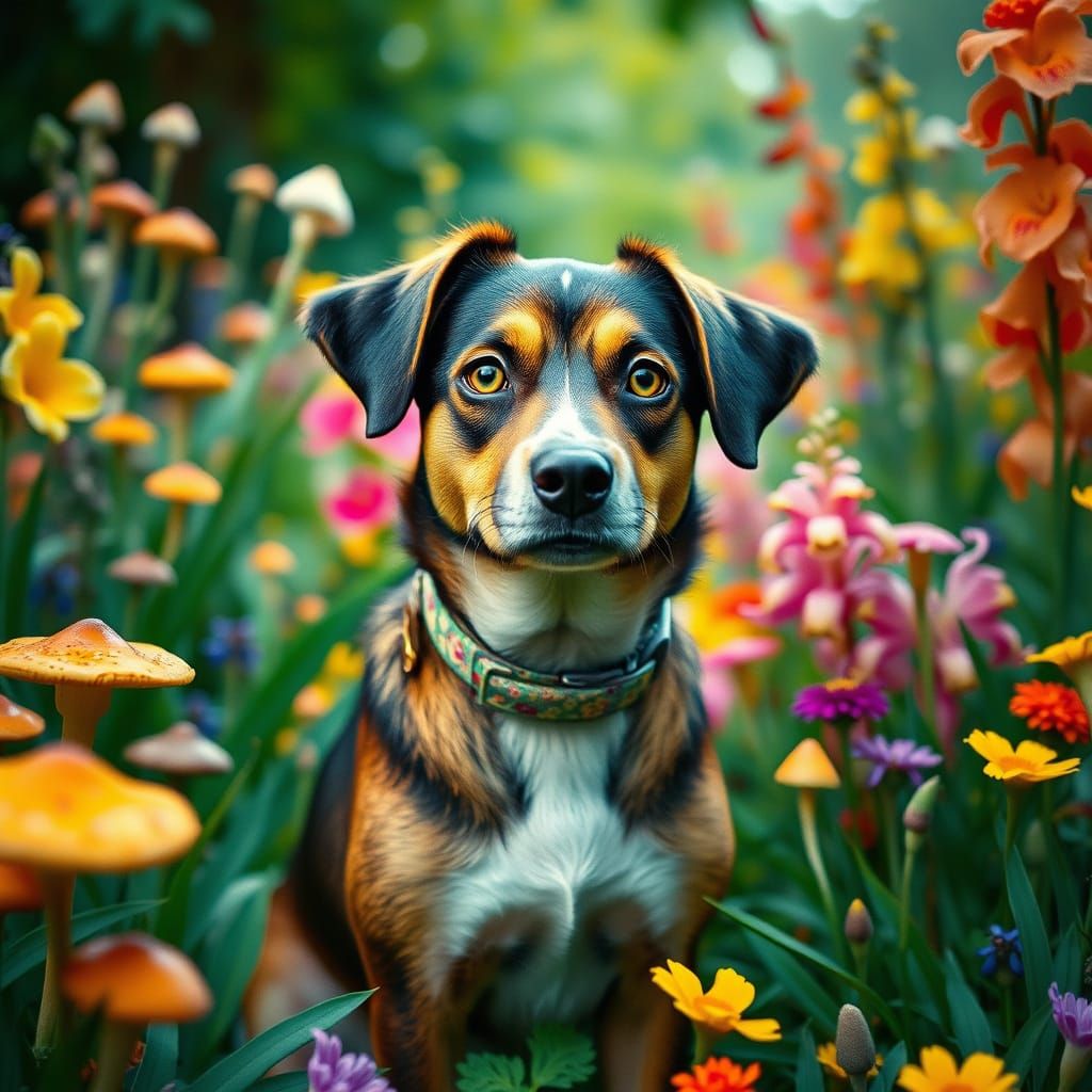A vibrant dog with striking turquoise and yellow eyes sits in an enchanted garden. This cinematic image captures the scene with film grain and rich colors, reminiscent of digital art.