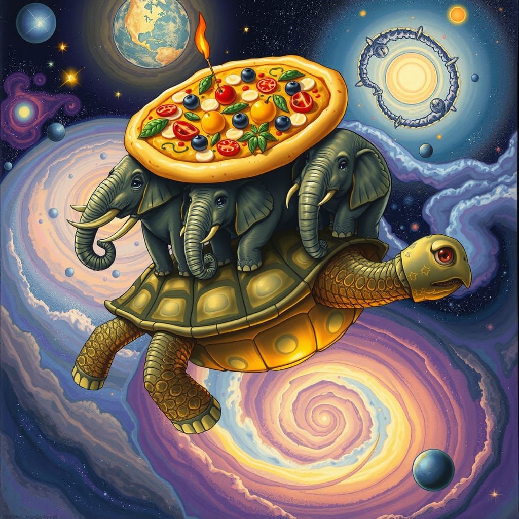 This image shows a flat pizza earth adorned with colorful toppings, carried by four elephants standing on a giant turtle's shell. The scene is set in a swirling galaxy, with whimsical details in a fantastical style.