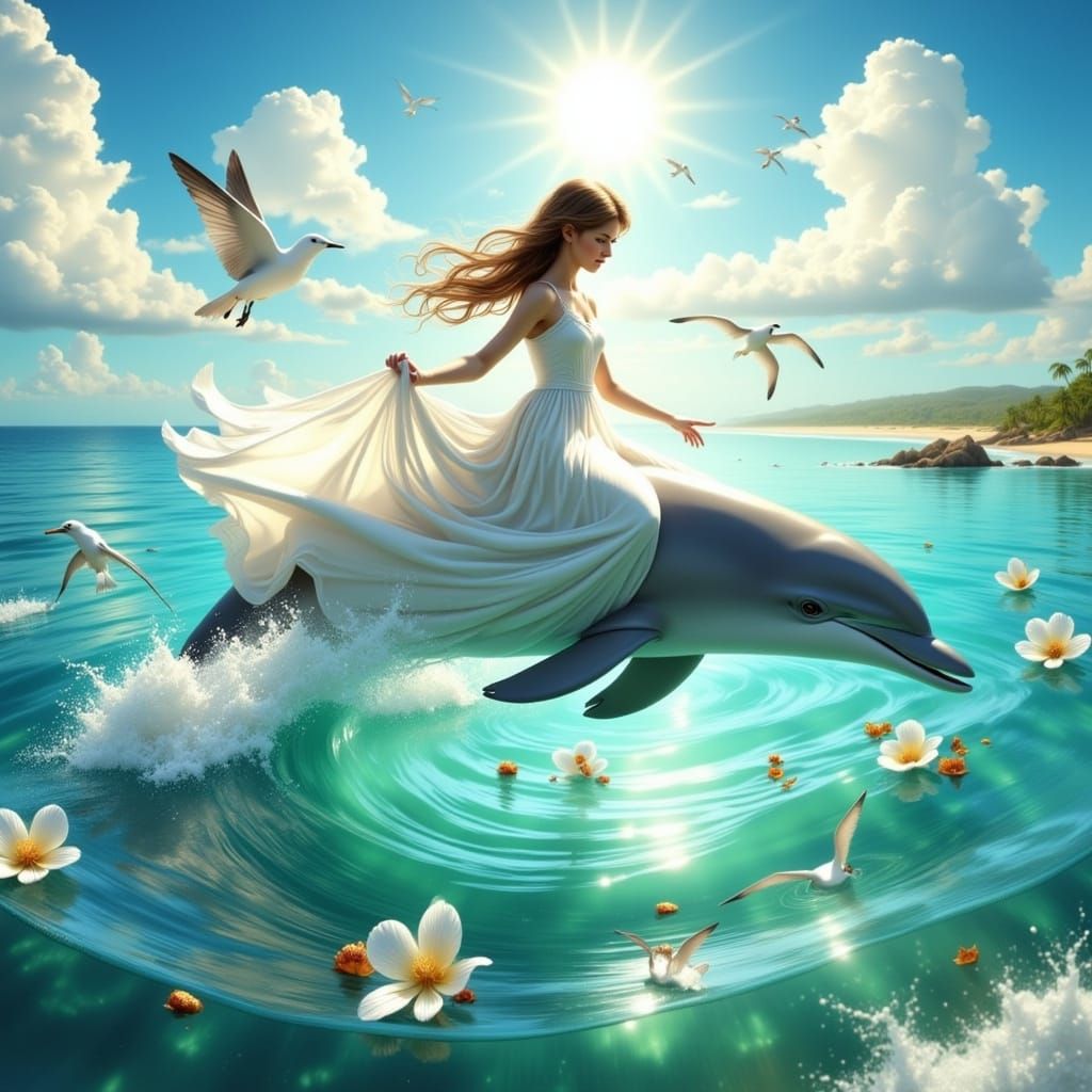 A serene and vibrant image of a girl riding a dolphin, surrounded by seagulls and flying fish, with a warm and sunny atmosphere, captured in a hyperrealistic style with dreamy textures and vivid colors.