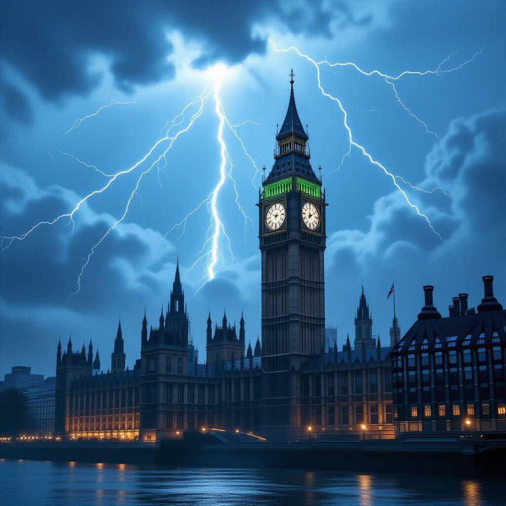 This image depicts the historic Parliament buildings transformed into futuristic launch silos and comms arrays, set against a dramatic, lightning-filled, electrically charged cloud layer.