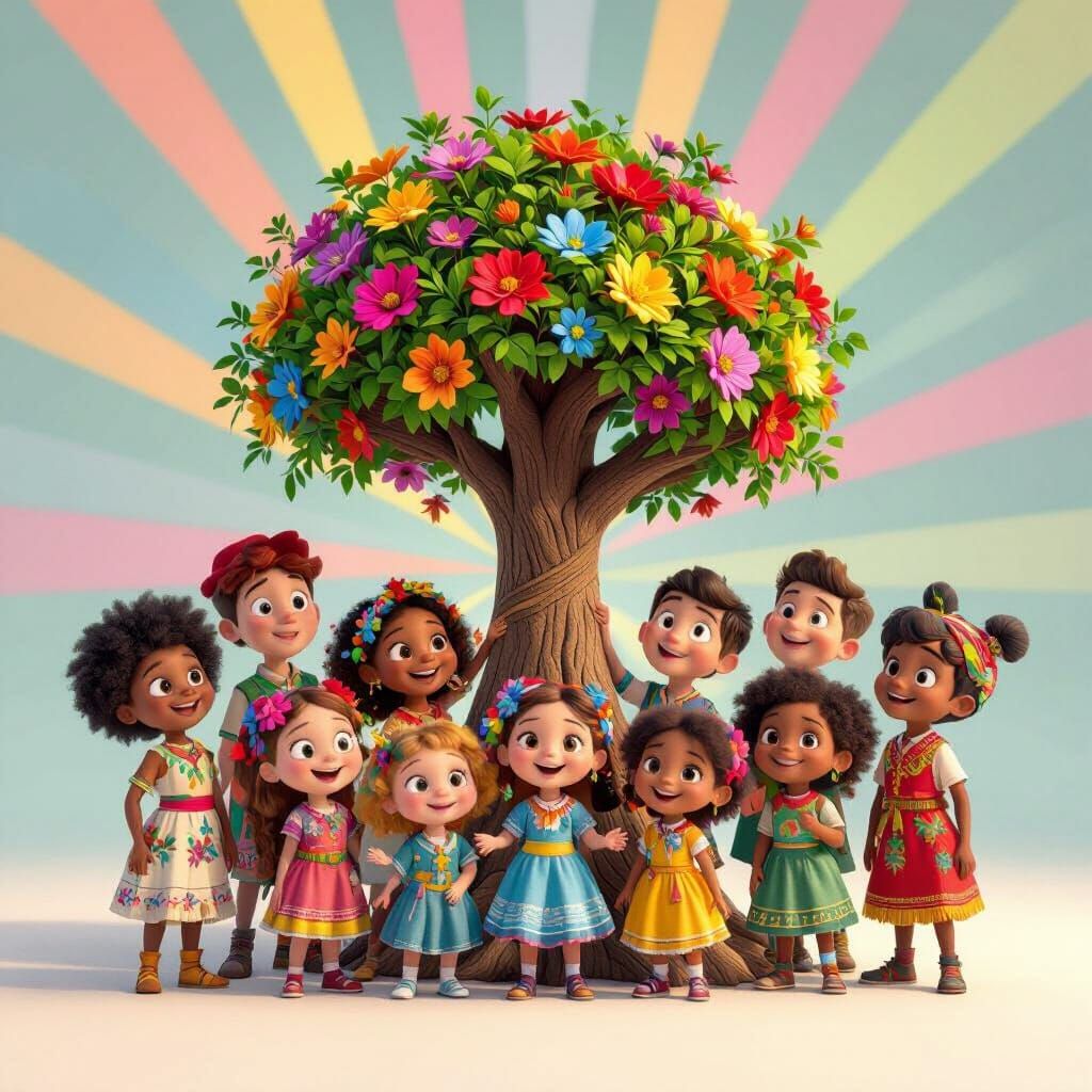This 3D digital art depicts joyful, diverse children in traditional attire gathered around a colorful value tree. Features bright, vivid colors and a playful, Pixar-inspired aesthetic.