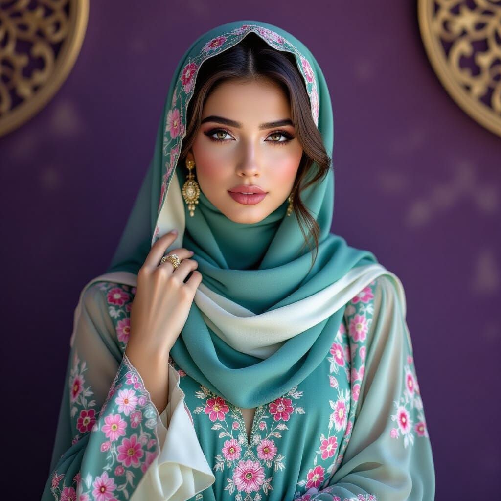 This image shows a young woman in a flowing teal and ivory hijab. Her serene face is framed by the soft fabric, with expressive eyes and delicate features. The portrait, reminiscent of photorealism, is set against a textured purple wall.