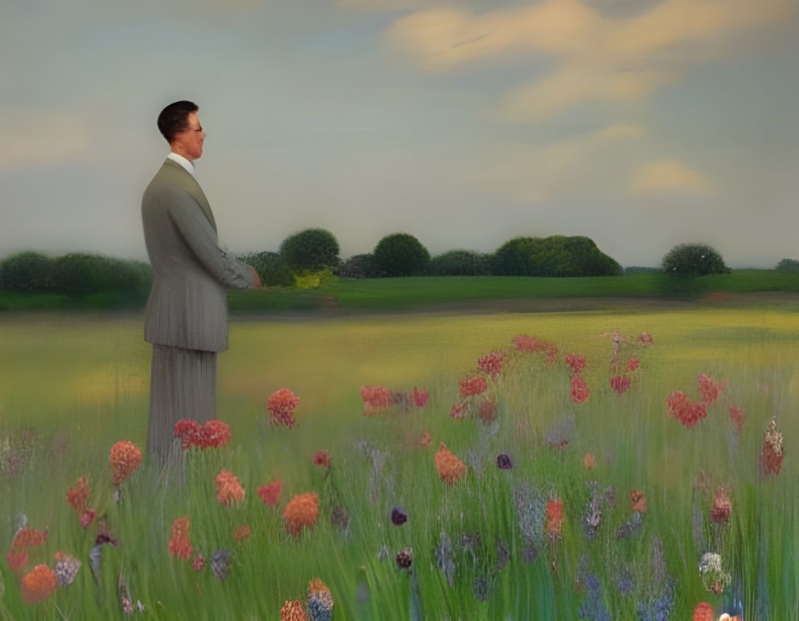 A beautiful portrait of a man in a field, reminiscent of Waterhouse's style. The subject wears 1950s attire amid swaying grasses, captured with soft lighting and delicate brushwork.