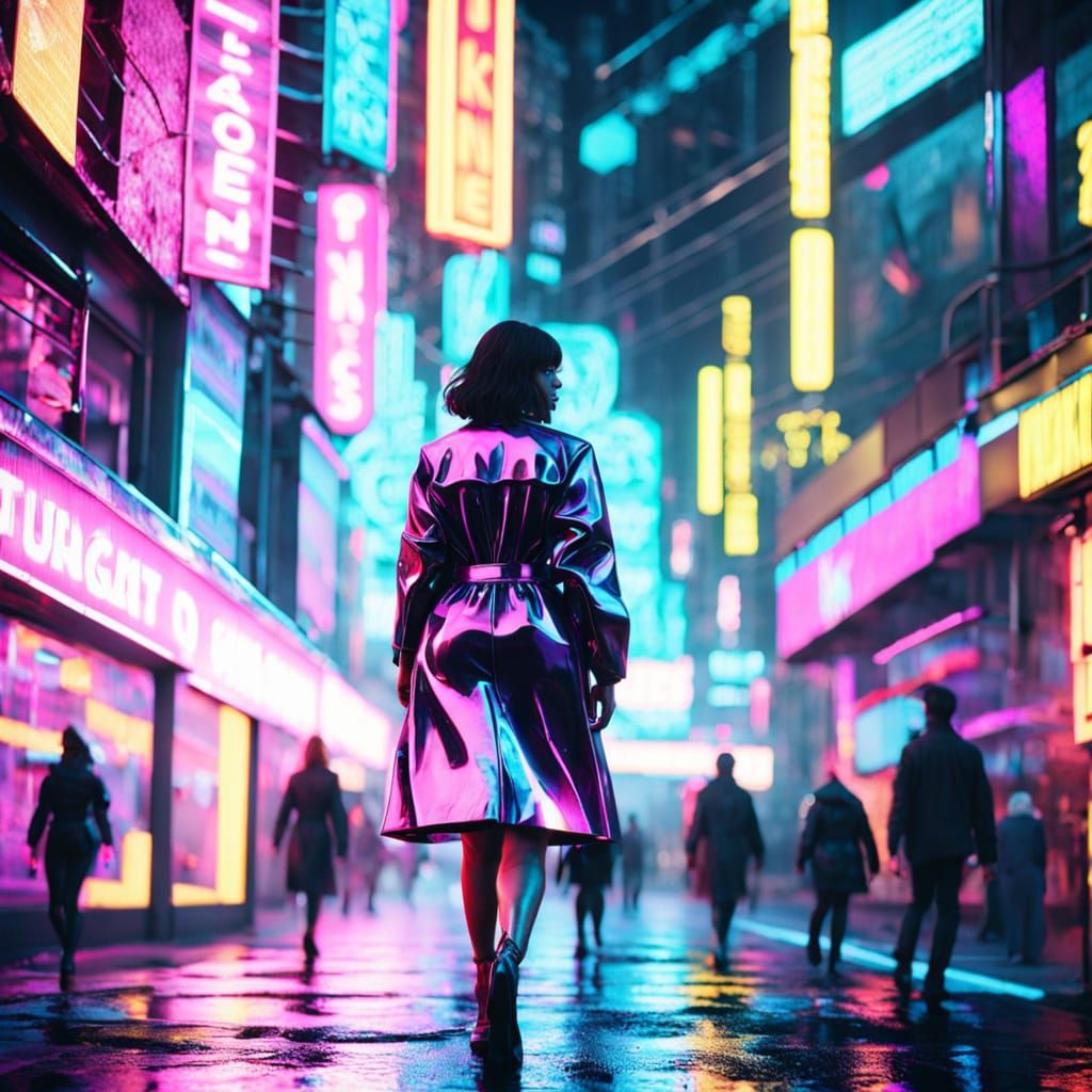 This image shows a woman walking through a city at night, bathed in neon light. The scene is reminiscent of retrofuturism, with glossy textures and atmospheric lighting.