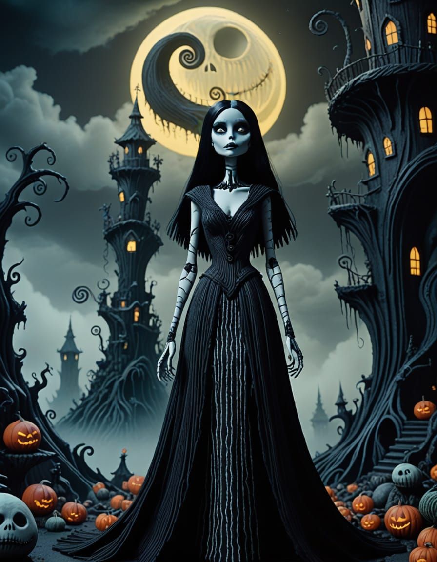 This image shows a gothic girl in a tattered gown gazing at a Mandelbulb 3D tower. The artwork is reminiscent of stop motion animation, with intricate details and contrasting colors.