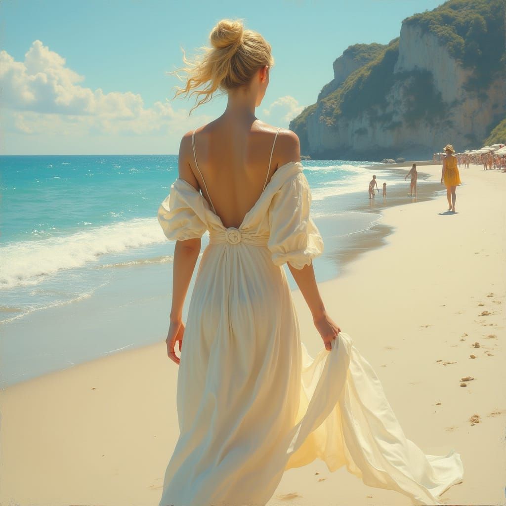 A refined European woman with blonde hair in a bun walks along a sunlit beach. She wears a light rainbow dress in a style reminiscent of 17th-century Dutch paintings.