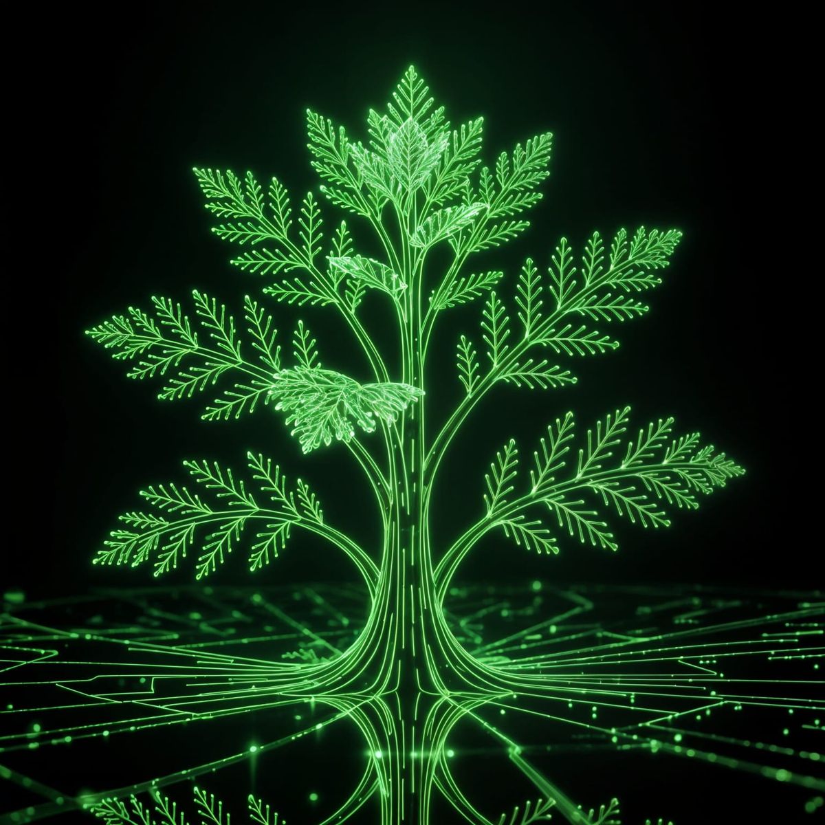 This image shows a hyperrealistic, glowing plant formed from shimmering green computer code. Intricate fractal patterns pulsate with neon light, blending organic beauty with cyber aesthetics in a dark, futuristic setting.