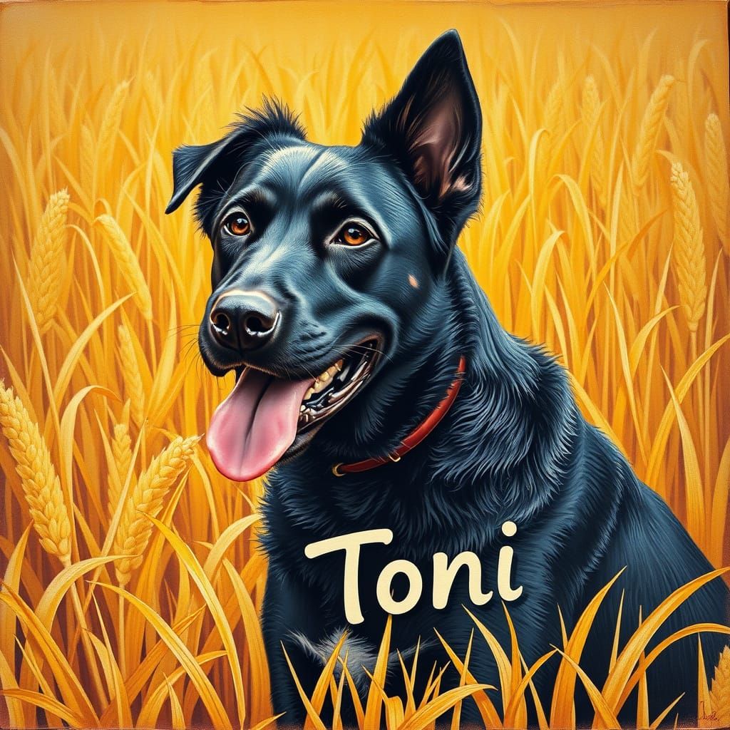 This image shows a large black dog with a shiny coat sitting in a golden wheat field, its tongue out and a joyful expression, with a wooden sign reading 'Toni' in the background, created in a style reminiscent of Robert Bateman's wildlife art, with textured influences and vibrant colors