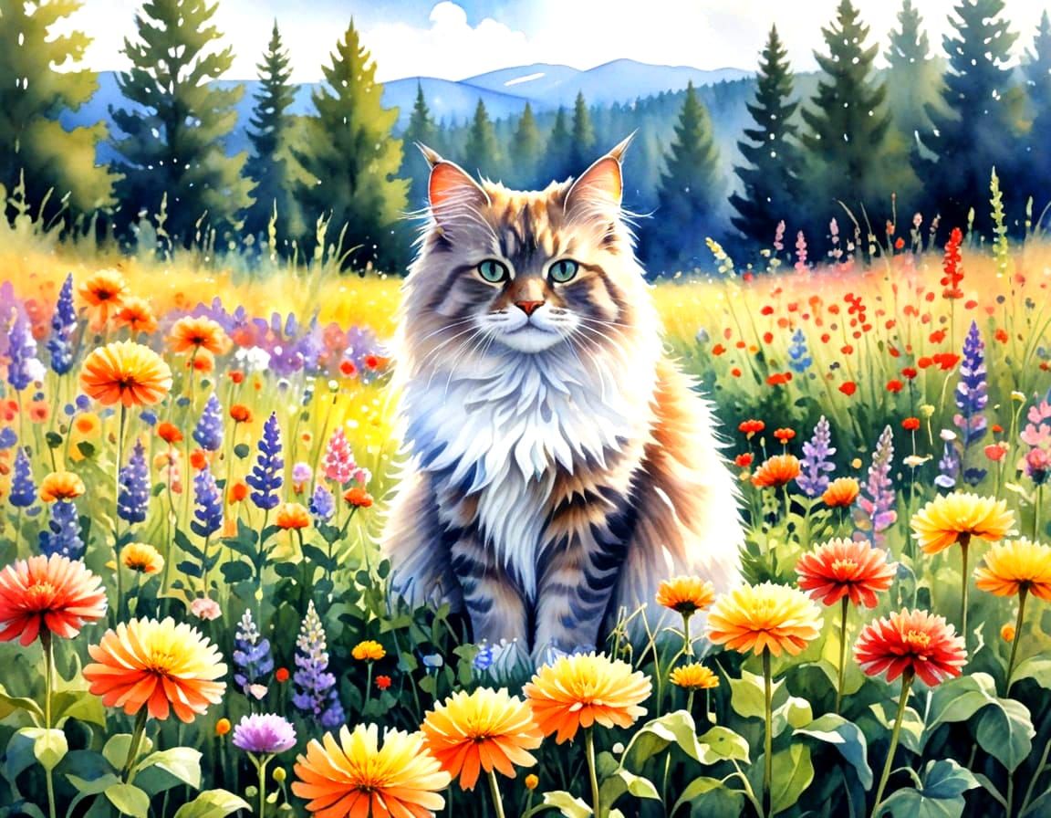 This image is a charming watercolor depiction of a fluffy cat amidst a lush flower field, capturing the serenity of a peaceful scene in delicate brushstrokes.