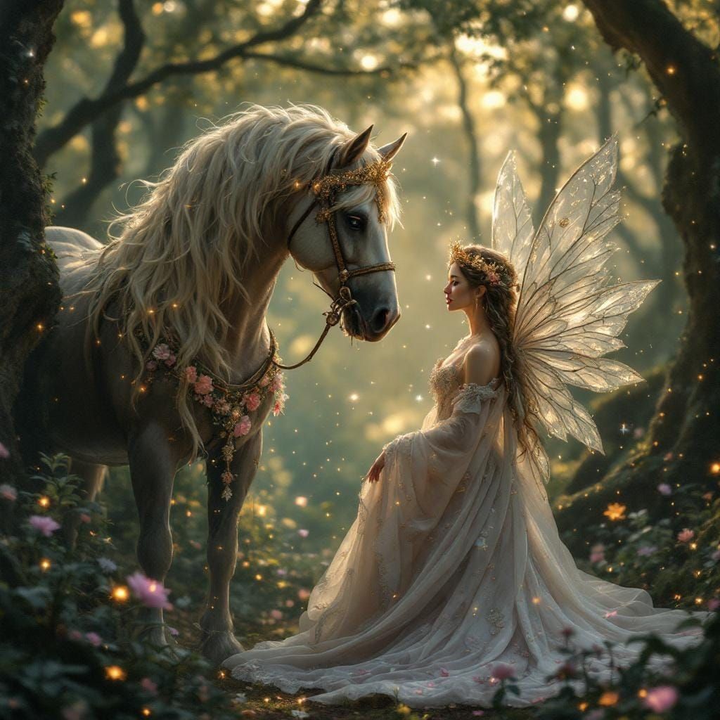 A majestic horse bows before a fairy queen in a glowing forest. The queen wears a star crown and gown with delicate wings, all illuminated in soft, ethereal light, in a whimsical fantasy style.