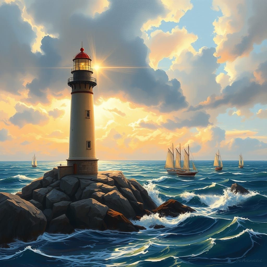 This image shows a majestic lighthouse on rocks, with sailboats on a choppy sea under a dramatic sky. Rendered in an oil painting style with bold brushstrokes and impressionistic colors, featuring warm golden hour light.